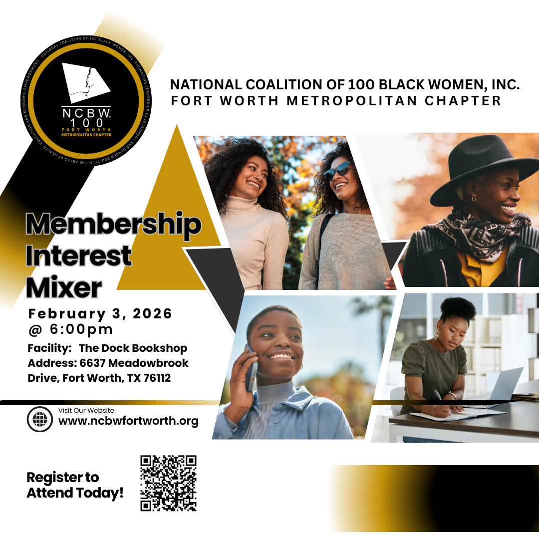 The National Coalition of 100 Black Women, Inc., Fort Worth Metropolitan Chapter is looking for ambitious and empowering women ready to make a difference. We invite you to join our movement and embark on a journey of connection, growth, and impactful service in the Fort Worth community!